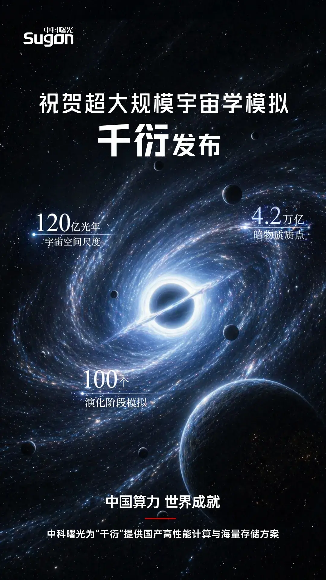 “千衍”实现了在上万张加速卡上进行长时间高效稳定计算的能力,标志着我国在高性能计算与宇宙学交叉融合方面取得重要突破。其中,中科曙光提供的国产高性能计算、海量存储方案,为这项基础科学突破筑牢算力底座。